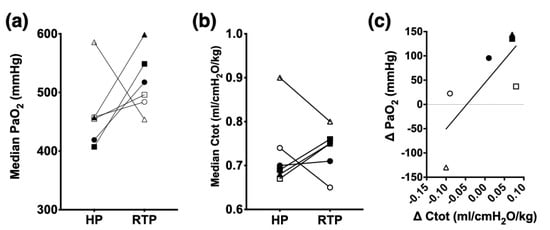 Indices of oxygenation, ventilation, and perfusion are summarized in Table 2. Statistically significant differences were detected between HP and RTP for PaO2, P-F ratio, and F-shunt at several time points during anesthesia. The treatment effect accounted for approximately half of the total variance (after adjusting for matching) with <1% chance of randomly observing the measured effect in an experiment of this size. The PaCO2 and Vd/Vt were not significantly different between RTP and HP. The Vd/Vt increased over time during RTP such that it was significantly greater at 90 and 120 min compared to 30 min of anesthesia. The 2 h median PaO2 of each horse is shown in Figure 2a, and the difference between group medians (437 mmHg and 502 mmHg during HP and RTP, respectively) was statistically significant (p = 0.03). The median P-F ratio was significantly (p = 0.03) greater during RTP (518 mmHg, range 484–598) than HP (455 mmHg, range 407–458). F-shunt was significantly lower during RTP (10.1%, range 4.2–11.7) than HP (14.2%, range 13.8–16.0). Individual Ctot values for each horse during HP (median 0.69 mL/cmH2O/kg) and RTP (median 0.75 mL/cmH2O/kg) are shown in Figure 2b, and the group medians were not significantly different. Spearman correlation between changes in PaO2 and Ctot for all horses (n = 6) was 0.64 (p = 0.09), and the results are shown in Figure 2c.