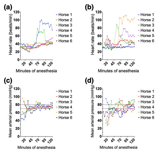Individual heart rate (top panels) and mean arterial pressure (bottom panels) recorded every 5 min during 2 h of isoflurane anesthesia in 6 healthy adult horses while positioned either horizontally (a,c) or on a 15° reverse Trendelenburg position (b,d). The dotted lines in the bottom panels indicate the target range for mean arterial pressure. Horses 5 and 6 in panel (c) and horses 1 and 6 in panel (d) were already receiving dobutamine at the first recording of mean arterial pressure.
