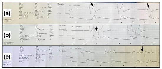 The junctional escape-capture bigeminy seen in one of the horses in the current study has not been previously reported in horses. Only two reports could be found in the veterinary literature, one in a domestic shorthair cat [50] and another in a Yorkshire Terrier dog [51]. In this horse, the junctional escape-capture bigeminy was not related to RTP since it occurred during HP. It coincided with starting dobutamine to correct hypotension in the presence of sinus bradycardia (heart rate of 20–25 beats/min). Upon starting dobutamine, occasional junctional escape beats were observed, followed by a junctional rhythm and then junctional escape-capture bigeminy. Bradycardia was the common finding among the two reported veterinary cases [50,51] and in this horse. In this horse, the escape-capture bigeminy subsided as the heart rate increased during anesthesia. This did not happen in the second anesthetic episode (RTP) in which bradycardia did not occur. In escape-capture bigeminy, a conducted complex can only follow an escape complex if the R-P interval of the retrograde P wave is sufficiently long (i.e., via the slow atrioventricular nodal pathway) to be conducted back to the ventricles via the fast atrioventricular nodal pathway. When the P wave is caused by retrograde conduction via the fast atrioventricular nodal pathway, anterograde atrioventricular nodal conduction is blocked, resulting in a blocked P wave [52], which was occasionally evident in the horse of the study.