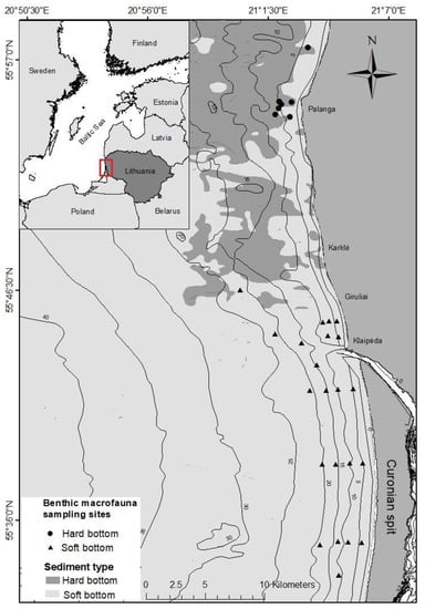 The south-eastern Baltic Sea coastal waters of the Lithuanian coast are characterised by different bottom sediments. A relatively uniform distribution of sands is typical along the Curonian spit, whilst the coastal waters along the mainland are characterised by a heterogeneous bottom composed of large boulders, gravels, and pebbles mixed with coarse, medium, and fine sand [28]. Due to these differences, the seabed of the study area was divided into hard- and soft-bottom according to the predominant sediment type (Figure 1).