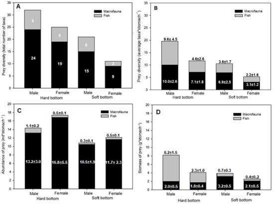 Diversity of prey as (A) total number of prey taxa, and (B) average number of taxa per stomach; (C) average abundance of prey (ind stomach−1) and (D) average biomass of prey (g stomach−1) for two major prey groups of long-tailed ducks collected in hard- and soft-bottom habitats. Labels indicate (A) the number of prey taxa, (B) the average prey abundance and standard error, and (C) the average prey biomass and standard error.