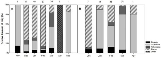 Long-tailed duck’s prey composition according to wet weight biomass (%) during the wintering period in (A) hard-bottom and (B) soft-bottom habitats. Upper numbers indicate sample sizes.