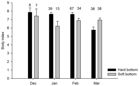 Long-tailed duck body index variation in two bottom types from December to May. Sample size is denoted by labels above histogram columns. Error bars represent the standard error of the mean.
