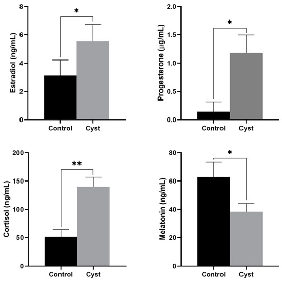 Concentrations of estradiol, progesterone, cortisol, and melatonin in the follicular fluid of cystic and control follicles. * Indicates statistically significant (p < 0.05); ** Indicates statistically extremely significant (p < 0.01).