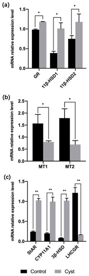 (a) mRNA levels for GR and 11β-HSD1/2 in the theca interna of cystic and control follicles. (b) mRNA levels of MT receptors in the theca interna of cystic and control follicles. (c) mRNA levels of steroidogenic enzymes and LHCGR in theca interna of cystic and control follicles. * Indicates statistically significant (p < 0.05); ** Indicates statistically extremely significant (p < 0.01).