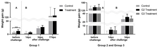 Panels A and B correspond to weight gain difference between the initial and before challenge, and weight gain difference after challenge respectively; *** p < 0.001, compared to that of the control group at different time intervals, by Student’s t-test.