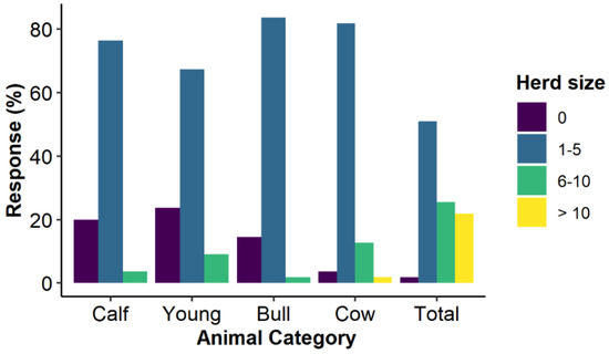 Dahomey cattle herds consisted of two to 23 Dahomey animals, with an average of seven animals per herd. Cows and bulls were the predominant categories. Calves and young cattle were absent in more than 20.0% of the herds (Figure 4). A total of 83.6% of the investigated herds only consisted of Dahomey cattle. The remaining herds (16.4%) included additional breeds such as Angus, Belgian Blue, Limousin and crossbreeds with Dahomey.