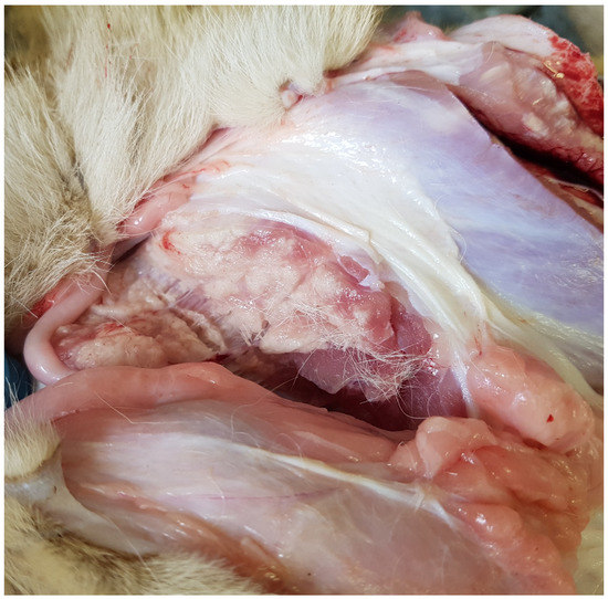 Cubs 1–3 and 5 were found dead; the remaining cubs were euthanized. Cubs 7 and 8 had been abandoned by the pride. The cubs were variously described as having paralyzed front legs (Cubs 3 and 4), crawling (Cub 6) and reluctant to walk, finding it difficult to stand (especially on the hind limbs), and creeping along with all four limbs flexed (Cubs 7 and 8). No traumatic lesions were found; the cubs had reduced skeletal muscle mass. Full post-mortem examinations (after euthanasia) of the cases showed multiple pale tan tracts (1–5 cm dia) in many skeletal muscle masses including the semi-membranous, pelvic girdle, intercostal, occipital, masseter and periocular muscles (Figure 1).