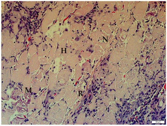 Polyphasic myopathy in Cub 8. Myofiber necrosis (N) is characterized by swollen fragmented fibers without striations. Mild mineralization (M), satellite cell hypertrophy (H) and myofiber regeneration (R) are present (Haematoxylin and Eosin stain).