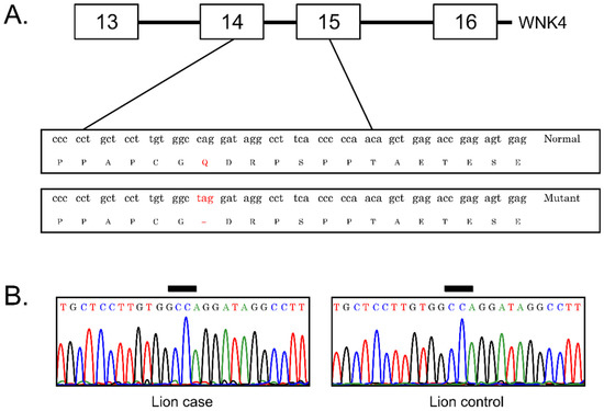 (A) Depiction of the predicted alteration in the WNK4 gene for the c.2899C>T mutation, which results in a premature stop codon; (B) representative chromatograms generated by fluorescent dye-primer sequencing of PCR products. The DNA sequence from the lion case was identical with that from healthy controls.