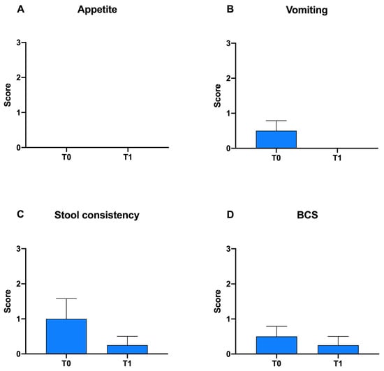 In Figure 1, differences in appetite, vomiting, stool consistency and BCS score within Group A at T0 vs. T1 are reported. A slight but not significant decrease was observed in vomiting, stool consistency and BCS score after probiotic administration (Figure 1B–D).