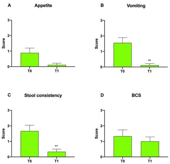 For Group B, a measurable but insignificant decrease was found in appetite and BCS scores (Figure 2A,D). On the other hand, a significant decrease in vomiting and stool consistency scores was observed in Group B at T1 with respect to T0, from 1.56 ± 0.33 to 0.11 ± 0.11 (**p < 0.01) and from 1.67 ± 0.37 to 0.33 ± 0.17 (**p < 0.01), respectively (Figure 2B,C).