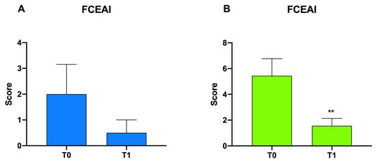 In Figure 3, differences in FCEAI scores in Group A and B at T0 vs. T1 are reported. A measurable but insignificant decrease in scores was observed in Group A after probiotic administration, while a significant reduction in scores in Group B, from 5.44 ± 1.32 to 1.56 ± 0.58 (**p < 0.01), was observed.