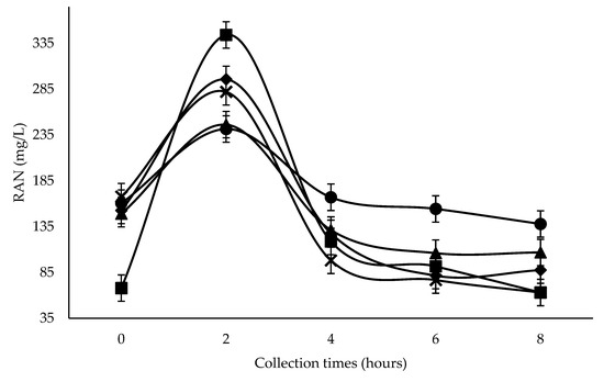 No interaction was seen between inclusion levels of SC and collection time regarding pH (p = 0.354), whereas RAN did exhibit an interaction (p < 0.001; Table 4 and Figure 1). At time 0 (before feeding), the lowest concentration was observed at 600 g SC+UAS/kg DM (68 mg/L). All treatments displayed greater RAN concentrations at 2 h (p < 0.001), with the highest concentration detected in the 600 g SC+UAS/kg DM treatment (334.2 mg/L; p < 0.001). Four hours after feeding, the highest RAN concentration was observed for 0 g SC+UAS/kg DM (167.1 mg/L), and the lowest for 300 g SC+UAS/kg DM (p = 0.022). The 0 g SC+UAS/kg DM treatment led to similar RAN concentrations at 0, 4, 6 and 8 h, and the same behavior was observed at the level of 150 g SC+UAS/kg DM.