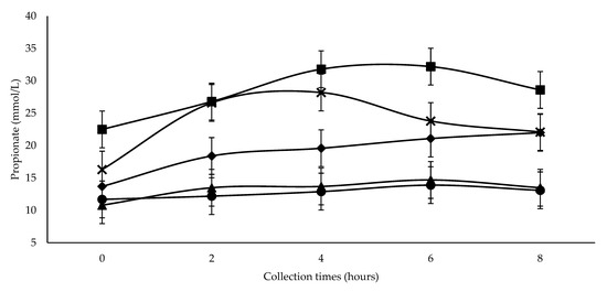 Effect of Treatment × Collection time interaction (p = 0.033) on propionate concentration in wethers feeding with 0 (●), 150 (▲), 300 (♦), 450 (×) and 600 (■) g SC+UAS/kg DM.