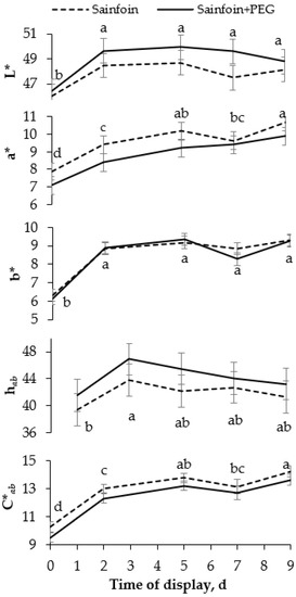 Evolution of instrumental color [lightness (L*), redness (a*), yellowness (b*), hue angle (hab), and chroma (C*ab)] of meat of suckling lambs according to the presence of proanthocyanidins (PAC) in their dams’ diet. Within a parameter, different letters mean differences at p < 0.05 among days. Vertical bars indicate the standard error of the mean.