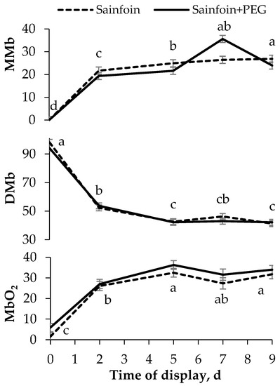Evolution of heme pigments [metmyoglobin (MMb), deoxymyoglobin (DMb), and oxymyoglobin (MbO2)] of meat of suckling lambs according to the presence of proanthocyanidins (PAC) in their dams’ diet. Within a parameter, different letters mean differences at p < 0.05 among days. Vertical bars indicate the standard error of the mean.
