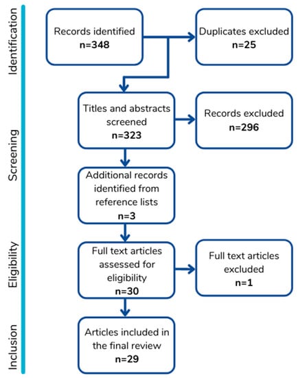 Diagram showing our process of identifying and screening articles for eligibility and inclusion, resulting in the 29 articles included in this metareview.