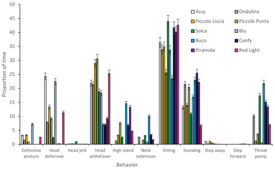 All data were uploaded into a Microsoft Excel 2013™ spreadsheet. Statistical analyses were performed using Minitab version 17. To analyze the behavioral impact of the approach tests and food interaction events, general linear mixed-effects models (GLMM) were run. Both the approach tests and food interaction events were combined into one single set of GLMMs. In these models, the behavior was included as the outcome, and the session type (food interaction events or approach), the individual tortoise and the person present (keeper, vet, or unknown observer) were used as predictors. The sex of the tortoise was initially used as a predictor, but due to its high collinearity with the individual, it was discarded.