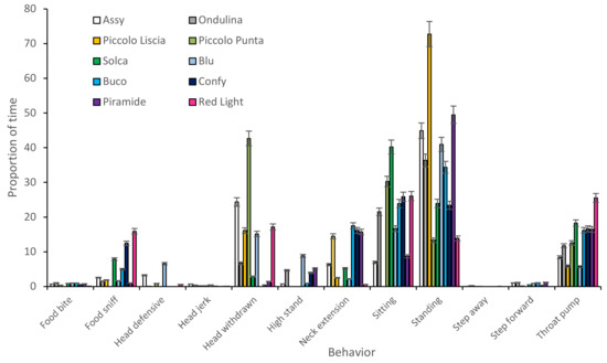 Each video was analysed using Behavioral Observation Research Interactive Software (BORIS) [43]. Continuous focal sampling was used to record all the behaviors exhibited by each individual during approach tests and food interaction events. Total video length for each individual varied greatly, for both approach tests and food interaction events. Therefore, the analysed data were exported to Microsoft Excel where the durations of state behaviors were converted into percentages of time and events were converted into counts per minute.