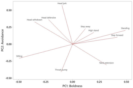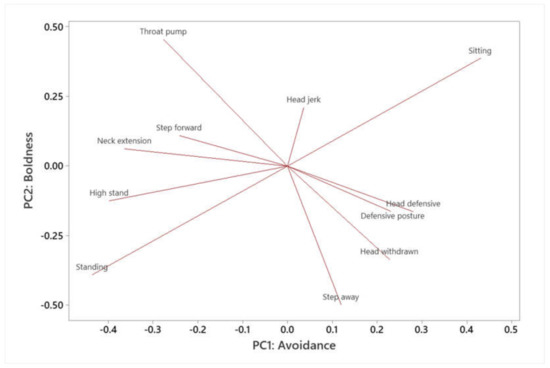 For the food interaction events (Figure 5), 10 Principal Components were identified. PC1 and PC2 explained 28.4% and 20.2% of the variance respectively: 48.7% of variance was explained in total (Table 6 and Table 7). As a result, the first two components were utilized. The behaviors were loaded in a similar fashion to those identified in the approach tests, though in this case, PC1 was positively loaded with bold behaviors (e.g., neck extension, step forward, standing) and PC2 was associated with avoidance behaviors (head jerk, head defensive, head withdrawn). As a result, this time PC1 was labelled as ‘boldness’ and PC2 was labelled as ‘avoidance’.