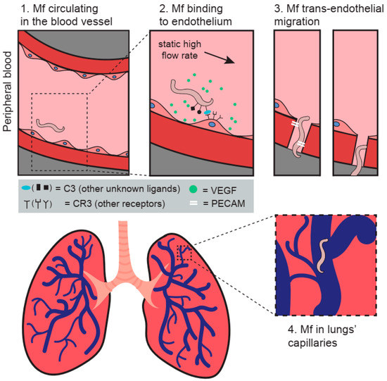 The figure presents a model of the potential trans-endothelial migration mechanisms adopted by Mf in the host. (1) Mf are circulating in the bloodstream during mosquito feeding time. (2) Increase in flow rate and the release of VEGF and likely other molecules promote the biding of Mf to the endothelium through complement component 3. (3) Mf trans-migration through the endothelium is likely enabled by CD31/PECAM-1. (4) Mf are sequestered in the lungs’ capillaries in respect to their circadian periodicity. The figure was designed and created by MEW and Paulina Wysmołek.