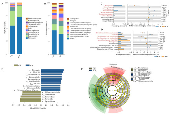 - Parks, D.H.; Tyson, G.W.; Hugenholtz, P.; Beiko, R.G. STAMP: Statistical analysis of taxonomic and functional profiles. Bioinformatics 2014, 30, 3123–3124. [Google Scholar] [CrossRef] [PubMed] [Green Version]