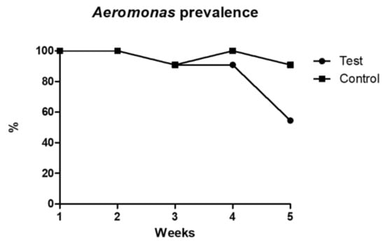 Aeromonas spp. isolation was achieved for all animals in the beginning of the trial. However, prevalence in each tank varied across the assay’s weeks. While Aeromonas spp. prevalence in the control tank was of 100% or close to it in every week, prevalence in the test tank decreased to 54.5% in the last week of sampling, although it displayed similar prevalence values to the control tank in the previous weeks (Figure 1). This variation was significantly different among tanks (p < 0.001).
