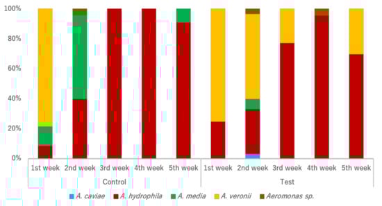 Initial Aeromonas species structures were similar between individuals from both tanks (Figure 2). Some shifts were observed along the assay weeks regarding species prevalence between the two tanks. Although A. veronii isolation in the test tank was possible across almost all sampling actions, such phenomenon was not observed in the control tank. Instead, an increase of A. media prevalence was found from the first sampling action to the second, with presence also recorded in the last week of sampling. Interestingly, the original predominance of A. veronii in both tanks was gradually substituted by a predominance of A. hydrophila in both tanks. Both the sampling tank and week significantly influenced the Aeromonas species’ structure. A. veronii was more prevalent in the test tank (p = 0.006) in comparison with the control tank, while an opposite trend was observed for A. media (p = 0.050). A. veronii prevalence also significantly shifted from week one, decreasing in the second and the third weeks (p < 0.001), and increasing in the final week (p < 0.001).
