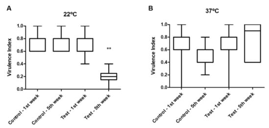 When testing the virulence factors’ phenotypic expression of the isolates at 22 °C (Figure 3), the virulence index values obtained for the isolates in the test tank in the fifth week were significantly lower than the ones in the control tank and the ones recorded for the first sampling week (p = 0.003). No differences were observed between the virulence indexes from isolates from both tanks (p = 0.337) at each sampling week (p = 0.580) when tested at 37 °C.