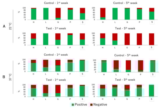 Relative prevalence of virulence factors by tank and sampling week of the isolates analyzed at 22 °C (A) and 37 °C (B). H—hemolytic activity, L—lipase activity, G—gelatinase activity, P—protease activity, S—slime production.