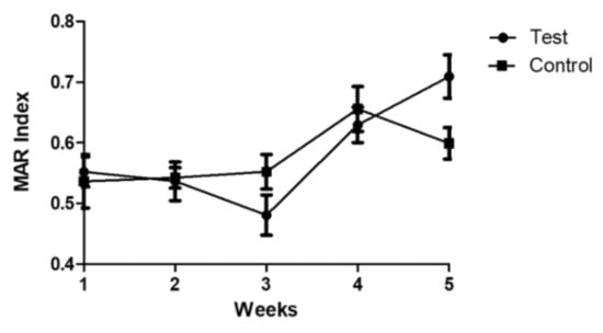 The vast majority of the isolates collected in both tanks were multidrug resistant (79%). Prevalence of multidrug resistant isolates was higher in the control tank (84%) than in the test tank (74.4%). The rate of multidrug resistance varied across the sampling weeks, but all the isolates collected in the fifth week in both tanks were multidrug resistant. The MAR index values did not differ between experimental conditions (p = 0.911). However, a variance across the sampling weeks was observed in the fourth week (p < 0.001) and in the fifth week (p = 0.003) and MAR index values significantly increased from the first to the fifth week of sampling (Figure 5).