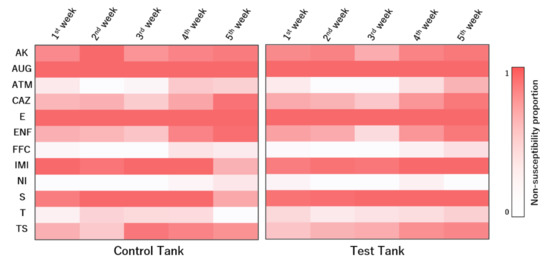 Relative prevalence of non-susceptibility to the tested antimicrobial compounds of the isolates collected in both tanks across the sampling weeks. AK—amikacin, AUG—amoxicillin/clavulanic acid, ATM—aztreonam, CAZ—ceftazidime, E—erythromycin, ENF—enrofloxacin, FFC—florfenicol, IMI—imipenem, NI—nitrofurantoin, S—streptomycin, T—tetracycline, TS—sulfamethoxazole/trimethoprim.