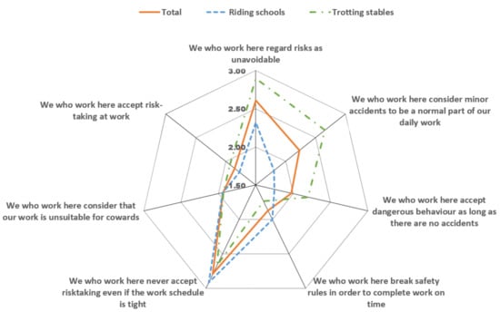 Dimension Dim5 had the lowest score for riding schools and trotting stables and there was a significant difference between these groups. Therefore, the seven statements included in Dim5 were studied in greater depth. The mean scores for each of the seven statements are presented in Figure 1. As can be seen from the diagram, the difference between riding schools and trotting stables was particularly evident for three statements: “We who work here regard risks as unavoidable”, “We who work here consider minor accidents to be a normal part of our daily work” and “We who work here accept dangerous behaviour as long as there are no accidents”. All three statements were given a higher score, indicating stronger agreement with the statements, by workers at trotting stables than by workers at riding schools (Figure 1).