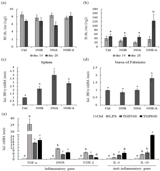 Effects of eTGP supplementation on the immunomodulatory effects in broilers. Effects of control (Ctrl) and 300 µg/mL eTGP supplemented before vaccination (300B), after vaccination (300A), and before and after vaccination (300B/A) on the serum (a) ND and (b) IB antibody titers of broilers at 14 and 28 days of age. Effects of Ctrl, 300B, 300A, and 300B/A on the IFN-γ mRNA expression in the (c) spleen and (d) bursa of Fabricius of broilers at 28 days of age. (e) Effects of supplementing eTGP on the various gene expression levels of TNF-α, iNOS, COX-2, IL-4, and IL-10 in the spleen of broilers challenged by LPS. Values are expressed as means ± standard deviation (n = 3). The means with different letter superscripts are significantly different (p < 0.05).