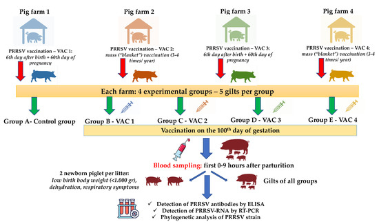 The objective of the present study was to investigate the effects of the application of the four commercial PRRS-1 MLV vaccines in pregnant gilts (at late stage of gestation) and its potential correlation with the health and immune status of their piglets. Therefore, we conducted an evaluation of the undesirable effects of late PRRSV MLV vaccination of pregnant gilts. The criteria used to assess the potential adverse effects included the possible congenital virus infection and viremia in gilts and their litters, the reproductive performance of gilts and the health status of their offspring. Furthermore, during the pre-trial period according to RT-PCR tests performed on serum samples of different age groups (breeding stock, weaners, growers, and fatteners) on experimental farms, no positive results were detected indicating that there was no wild-type PRRSV circulation in the herds.