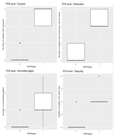 Serum samples from all study gilts were tested negative for PRRSV by SYBR Green ReTi RT-PCR. A small percentage of the samples (10% = 20/200) were positive by RT-PCR. RT-PCR positive PRRSV serum samples obtained from piglets born in group C gilts, on farm 1. The remaining RT-PCR positive serum samples were collected from piglets born in group D gilts, on farm 2. Figure 2 displays the difference between the number of piglets with dyspnea, respiratory signs, splay-leg, and the number of mummified piglets, given the result of the PCR examination. Dyspnea, respiratory signs, splay-leg, and fetal mummification are more observed in piglets with positive PCR result.