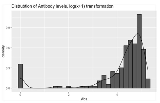 Shows the transformed (log(x + 1)) distribution of the piglets’ Ab levels. The figure was constructed using the “ggplot” function from the “ggplot2” R-package [43], in the R programming language. Abs: Antibodies.