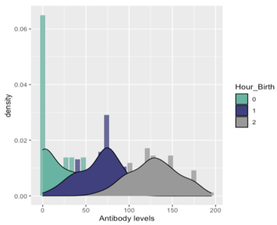 Fitted densities to the distribution of Antibodies for each level of Hour_birth [0: 0–3 h, 1: 3–6 h, and 2: > 6 h].