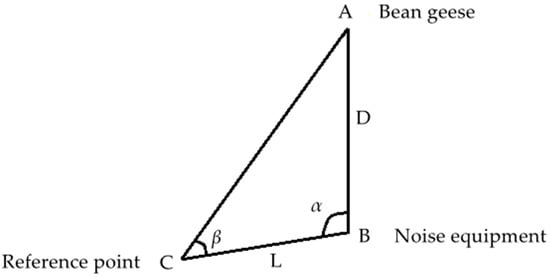 Bean geese remain mostly in the paddy field or forage on the beach. When observers approached, they flew away. Therefore, the principle of triangulation was adopted to calculate the nearest distance between the animals and noise source (Figure 1). The three vertices were bean geese distribution area (point A), noise equipment (point B) and reference point (point C). An electronic Total Station was used to measure the two interior angles, α and β, of vertex B and C in the triangle, and measure the distance L between point B and point C, as well as calculate the distance, D, between point B and point A. By using this method, noise equipment could be arranged in the area far from the distribution area of bean geese, which could avoid the influence on the waterbirds as much as possible and meet the requirements of this experiment. The calculation formula is as follows: