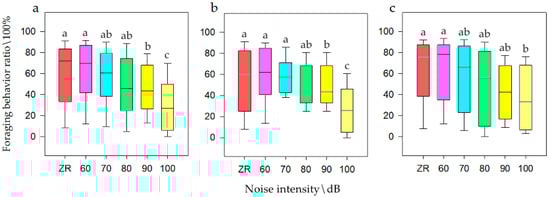 Foraging behavior of bean geese ((a) Population N; (b) Population N1; (c) Population N2) of different noise intensity (ZR (background noise), 60, 70, 80, 90, and 100 dB). Different letters in the graphs represent significant differences from one-way ANOVA and SNK test. Bars represent means; error bars denote standard deviations. The bar with the highest foraging behavior ratio is marked as “a”. The foraging behavior ratio is compared with other noise gradients, and the difference is significant, marked as “b” and “c”.