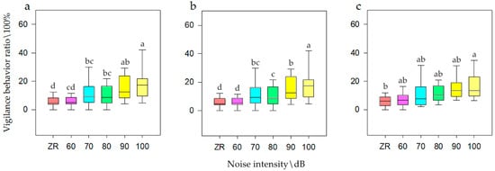 Vigilance behavior of bean geese ((a) Population N; (b) Population N1; (c) Population N2) of different noise intensity (ZR (background noise), 60, 70, 80, 90, and 100 dB). Different letters in the graphs represent significant differences from one-way ANOVA and SNK tests. Bars represent means; error bars denote standard deviations. The bar with the highest vigilance behavior ratio is marked as “a”. The vigilance behavior ratio is compared with other noise gradients, and the difference is significant, marked as “b” and “c”.