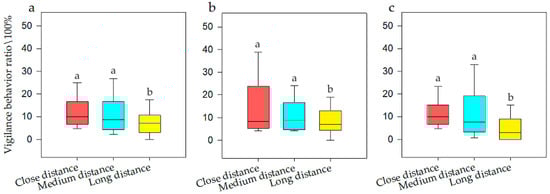 Vigilance behavior of bean geese ((a) Population N; (b) Population N1; (c) Population N2) of close distance, medium distance, and long distance. Different letters in the graphs represent significant differences from one-way ANOVA and SNK tests. Bars represent means; error bars denote standard deviations. The bar with the highest vigilance behavior ratio is marked as “a”. The vigilance behavior ratio is compared with other interference distances, and the difference is significant, marked as “b”.