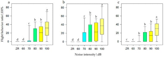Flight behavior of bean geese ((a) Population N; (b) Population N1; (c) Population N2) of different noise intensity (ZR (background noise), 60, 70, 80, 90, and 100 dB). Different letters in the graphs represent significant differences from one-way ANOVA and SNK tests. Bars represent means; error bars denote standard deviations. The bar with the highest flight behavior ratio is marked as “a”. The flight behavior ratio is compared with other noise gradient, and the difference is significant, marked as “b”, “c”, and “d”.