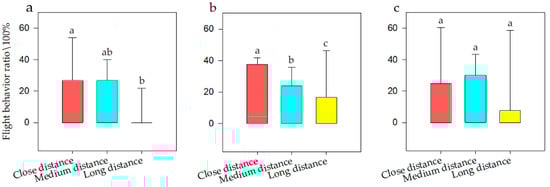 Flight behavior of bean geese ((a) Population N; (b) Population N1; (c) Population N2) of close distance, medium distance, and long distance. Different letters in the graphs represent significant differences from one-way ANOVA and SNK tests. Bars represent means; error bars denote standard deviations. The bar with the highest flight behavior ratio is marked as “a”. The flight behavior ratio is compared with other interference distances, and the difference is significant, marked as “b”.
