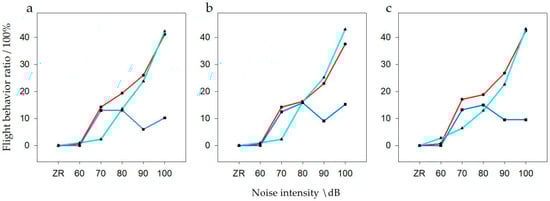 Flight behavior of bean geese ((a) Population N; (b) Population N1; (c) Population N2) of different noise intensity (ZR (background noise), 60, 70, 80, 90, and 100 dB) and interference distances. The red line of black points in the graphs represent close distances; the light blue line of triangular points in the graphs represent medium distances; the blue line of square points in the graphs represent long distances.