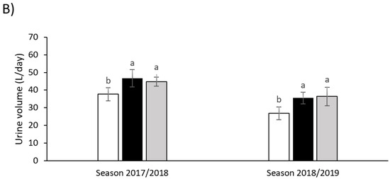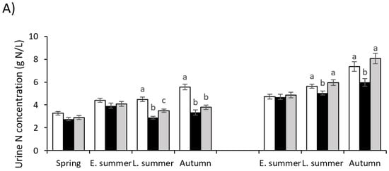 (A) Urinary N concentration and (B) urine volume from lactating dairy cows grazing plantain (black), plantain–clover (grey), and ryegrass–white clover (white) pastures in spring, summer (early and late), and autumn over two years. a,b,c letters indicate values in each season that are significantly different (p < 0.05).