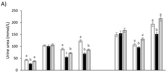 Blood samples (10 mL) were taken from the coccygeal vein of each cow and centrifugated at 3000× g for 15 min at 4 °C. Then, a sample of plasma was transferred into 2 mL micro-tubes and stored at −20 °C until later analysis of urea. The urea concentrations in the urine and plasma were determined using the Urease Kinetic UV assay.