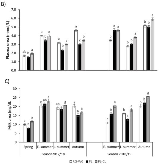 Urea concentration in (A) urine, (B) plasma and (C) milk of cows grazing plantain (black), plantain–clover (grey), and ryegrass–white clover (white) pastures in spring, summer (early and late), and autumn during the 2017/2018 (left) and 2018/2019 (right) lactating seasons. a,b,c letters indicate values in each season that are significantly different (p < 0.05).