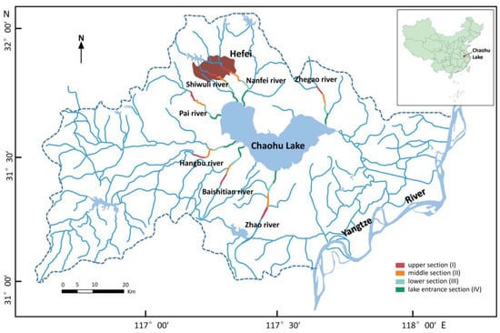 Study area with the seven rivers entering Chaohu Lake, China (the brown area is Hefei, the capital of China’s Anhui province).